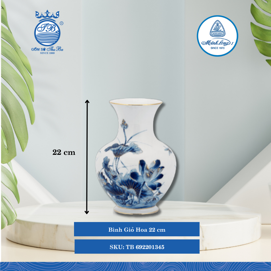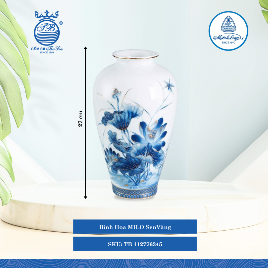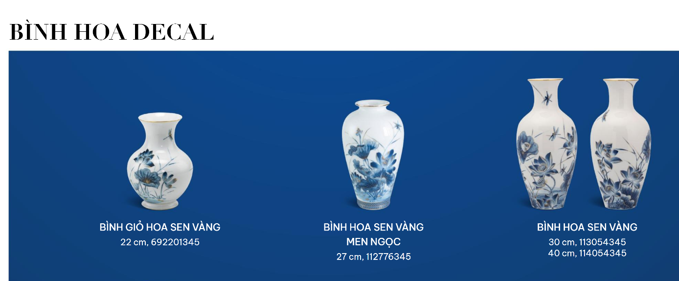 Bình hoa Sen vàng được chế tác sinh động với nghệ thuật vẽ tay tinh tế, tái hiện đầy đủ hồn sắc của loài hoa sen bình dị, thanh tao nhưng không kém phần sang trọng, hiện đại. Điểm xuyến là màu xanh cobalt đặc trưng, truyền thống, nổi tiếng của Việt Nam (blue Huế) phối cùng nền vàng vương giả, đặc trưng trên thân sứ trắng được phủ men ngọc. Họa tiết được vẽ điểm vàng 24k giúp “Sen Vàng” như một bức tranh sang trọng, quý phái. Khoác lên vẻ truyền thống, nền nã của loài hoa Á Đông nhưng lại không kém phần tinh tế hiện đại, những cánh sen bung tròn, phúc hậu ôm lấy nhụy đã được tái hiện sống động bằng màu xanh cobalt đặc trưng của cung đình Huế. Bức tranh chân thực và sống động về lá, cỏ và hoa sen như đưa người ngắm về với một làng quê Việt Nam vốn yên bình, trù phú… Nghệ nhân cũng khéo léo tạo nét vương giả bằng những chi tiết vẽ vàng 24k uyển chuyển trên từng cánh hoa, vành, tay cầm và nắp tạo nên sắc màu lấp lánh dưới sự phản chiếu của ánh sáng. Bộ sản phẩm thích hợp cho những buổi sum họp thân tình trong không gian yên bình, thư giãn vừa gần gũi vừa sang trọng.