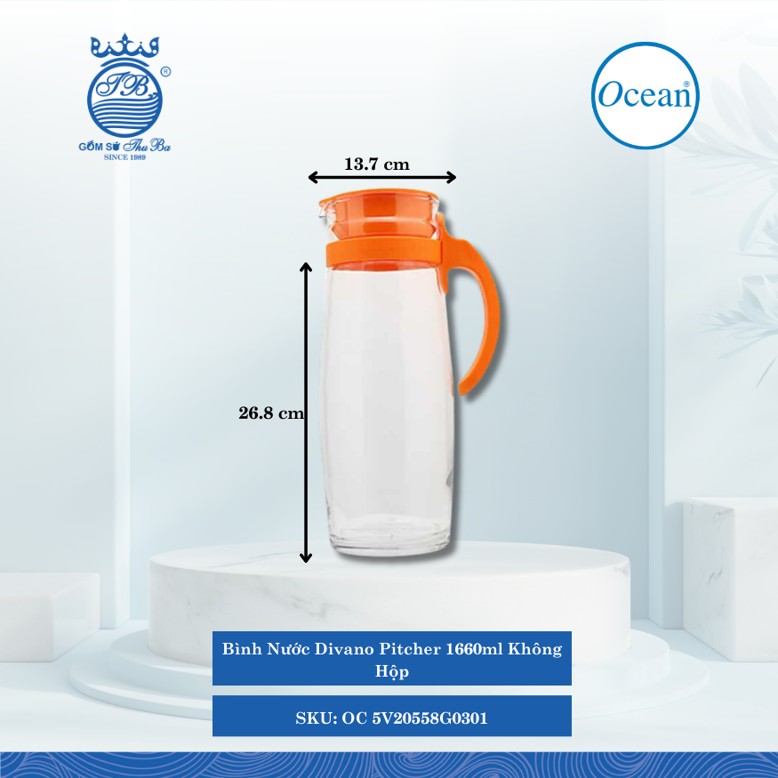 Bình nước thủy tinh quai nhựa Divano Trơn - 1.6 lít chính hãng Ocean Thái Lan với thiết kế dày dặn đẹp chắc chắn. Sản phẩm có thể dùng đựng nước trắng nước lọc hay nước hoa quả…sang trọng và lịch sự Được làm từ chất liệu thủy tinh, sản phẩm có bề mặt sáng bóng, thành bình dày dặn.