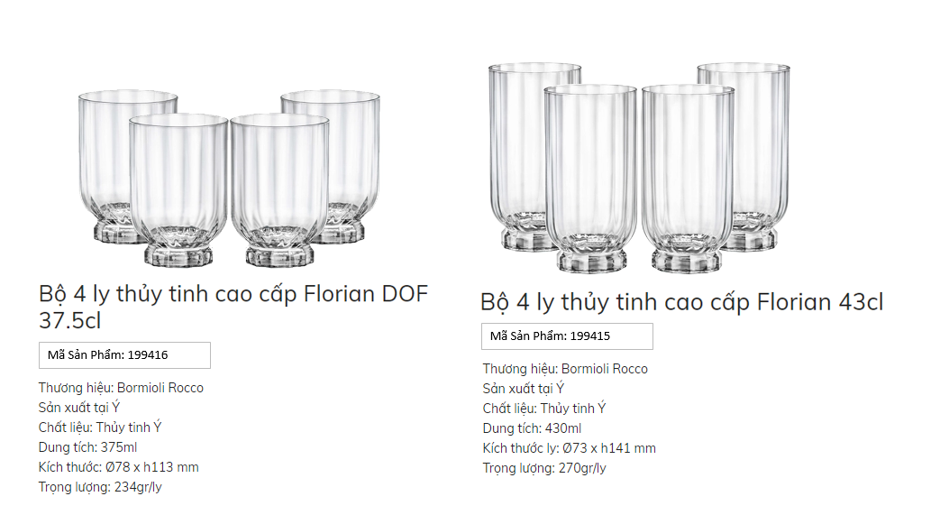 Thương hiệu Bormioli của Ý, không chỉ đáp ứng hầu hết các nhu cầu về chai lọ, ly cốc, chén, đĩa... của ngành dược phẩm, mỹ phẩm, thực phẩm và ăn uống mà còn đã trở thành tập đoàn hàng đầu Châu Âu chuyên cung cấp đầy đủ và đa dạng các sản phẩm bằng thủy tinh phục vụ trên bàn ăn. Sang trọng, phong cách và tinh tế tạo nên bộ ba giá trị mà dòng sản phẩm Bormioli mang đến cho mọi bữa tiệc của bạn. Với sự cải tiến không ngừng về thiết kế và chất lượng nhưng vẫn duy trì được sự tiện dụng truyền thống và độ bền cao, sản phẩm này đã đáp ứng hầu hết các tiêu chuẩn khắt khe của Châu Âu cũng như những yêu cầu phục vụ chuyên nghiệp nhất.