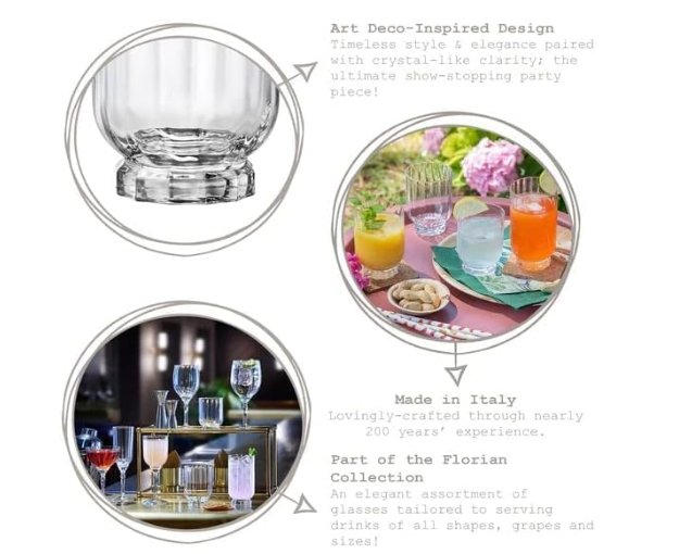 Bộ sưu tập ly thủy tinh Florian từ Bormioli Rocco với phong cách Italy xa hoa, sang trọng tạo điểm nhấn tinh tế cho ngôi nhà, quán bar hoặc nhà hàng của bạn. Với dung tích và kích cỡ đa dạng, dòng ly thủy tinh Florian có thể dùng để phục vụ các loại rượu vang trắng, vang đỏ, vang hồng hay các loại rượu mạnh, cocktail, nước ngọt, nước trái cây và nước lọc,...