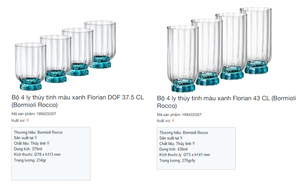 Thương hiệu Bormioli của Ý, không chỉ đáp ứng hầu hết các nhu cầu về chai lọ, ly cốc, chén, đĩa... của ngành dược phẩm, mỹ phẩm, thực phẩm và ăn uống mà còn đã trở thành tập đoàn hàng đầu Châu Âu chuyên cung cấp đầy đủ và đa dạng các sản phẩm bằng thủy tinh phục vụ trên bàn ăn.