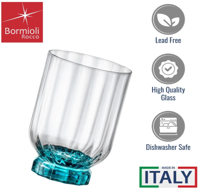 Bộ 4 ly uống thủy tinh Florian màu xanh (Bormioli Rocco) có hộp đẹp, thích hợp làm quà tặng đối tác, khách hàng, tặng tân gia,....
