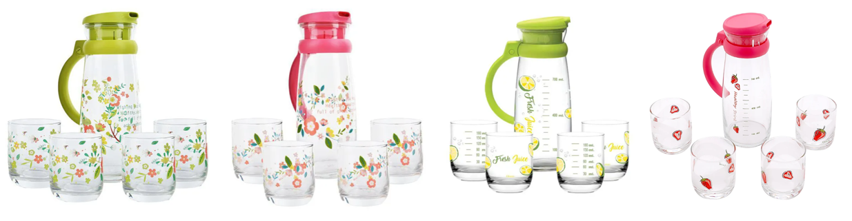 - Bộ Bình ly thủy tinh nắp màu nhựa có quai tiện lợi thường đựng nước trắng hoặc nước hoa quả. Bộ bình thủy tinh Maison được làm từ chất liệu thủy tinh. Sản phẩm có bề mặt sáng bóng, thành bình dày dặn.