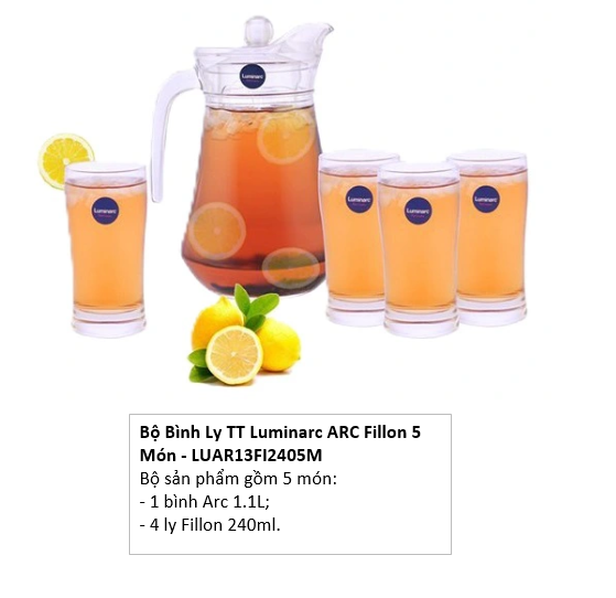 - Bộ sản phẩm gồm: 1 bình Arc 1.1L; 4 ly Fillon 240ml.