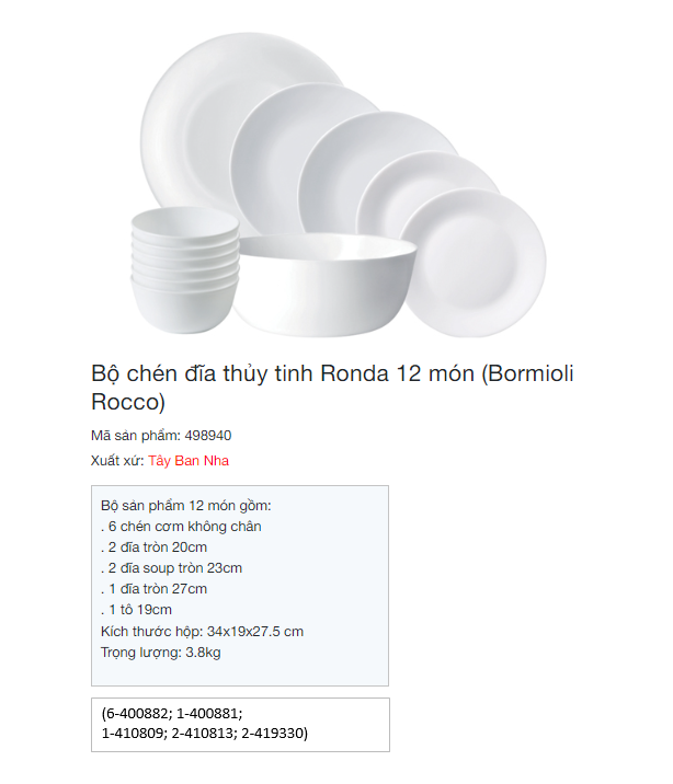 Trọn bộ sản phẩm chén đĩa thủy tinh Ronda 12 món bao gồm: