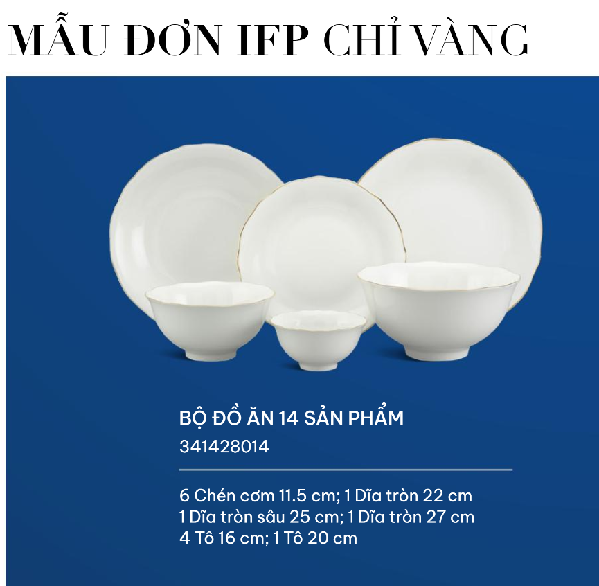 Đây là dòng sản phẩm sứ ngà cao cấp - IFP (Ivory Fine Porcelain) được tuyển chọn từ những nguyên liệu tốt nhất cùng công nghệ phối liệu đặc biệt, qua quá trình kiểm định nghiêm ngặt để tạo ra những sản phẩm vừa đảm bảo kỹ thuật và mỹ thuật với tính năng vượt trội: siêu cứng, chắc, mặt men bóng, khó trầy xước; không chứa chì và cadmium nên an toàn cho sức khỏe; đặc biệt sử dụng tiện lợi được trong lò vi sóng, máy rửa chén và lò nướng…