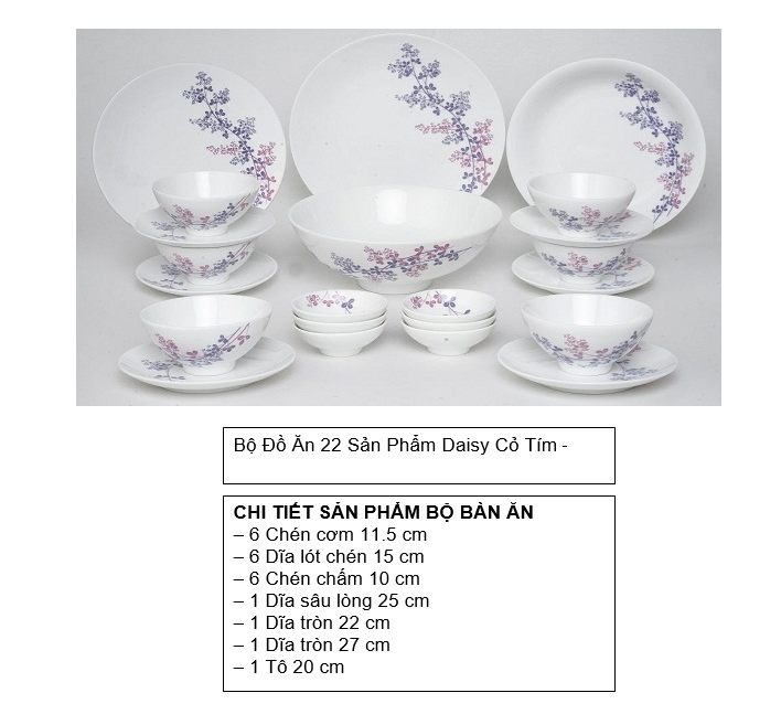 Bộ bàn ăn gốm sứ Minh Long Daisy cỏ tím 22 sản phẩm gồm: