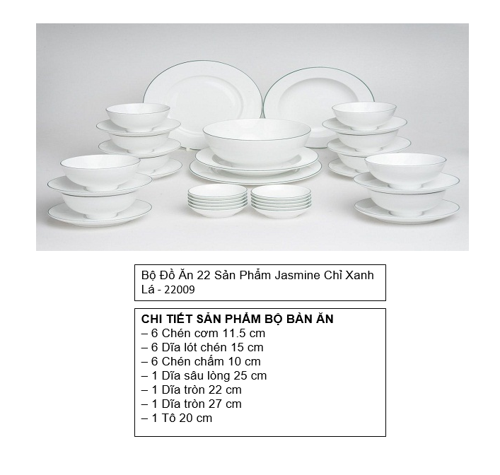 Sự phối kết giữa men sứ trắng và đường chỉ xanh lá chưa bao giờ lỗi mốt và đã tạo cho Jasmine Chỉ xanh lá điểm nhấn đặc biệt bởi nét mềm mại, thanh thoát mà sang trọng, tô điểm không gian ẩm thực thêm phần tươi mát và mới mẻ.