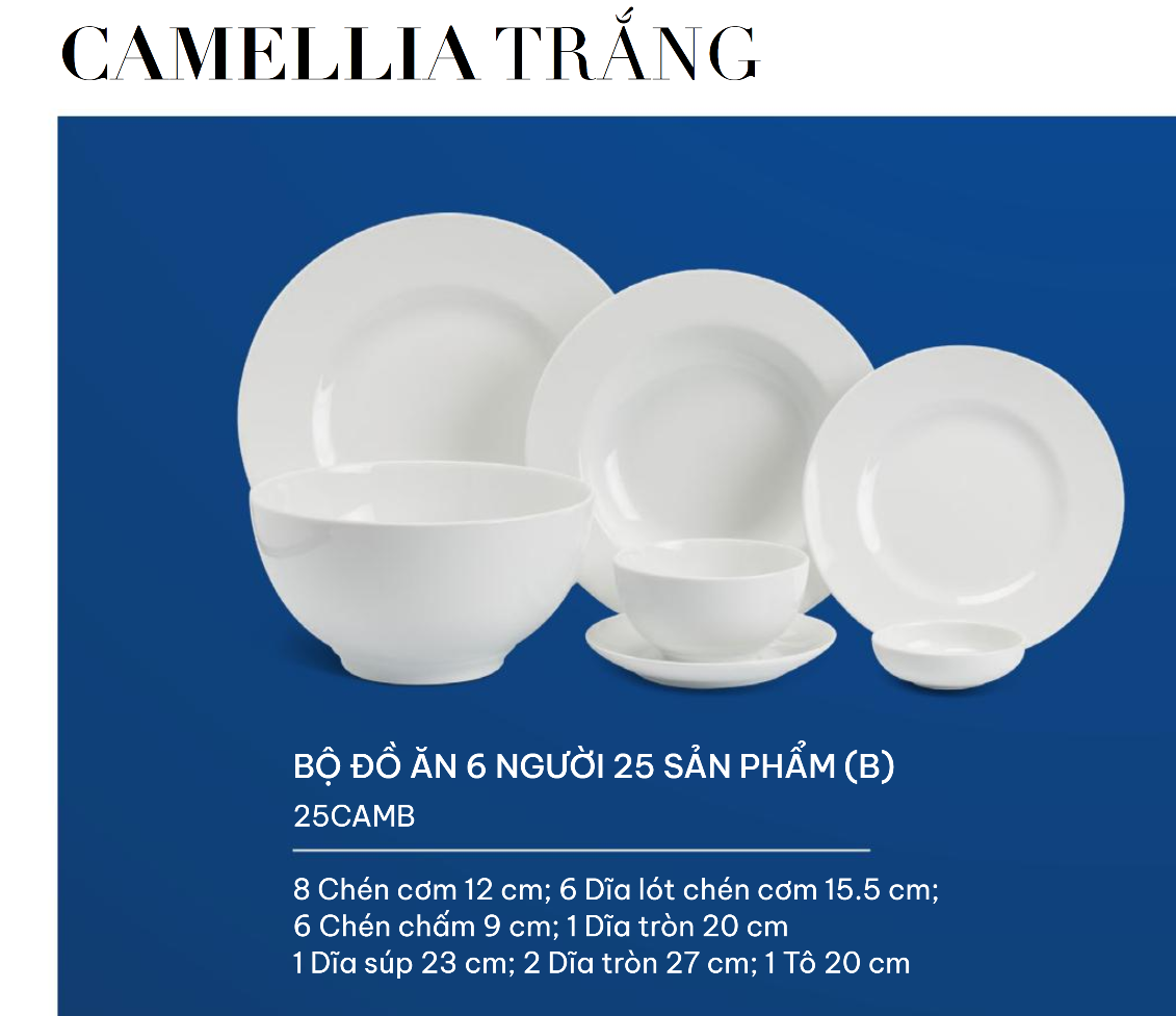 Camellia trắng như cô gái mộc mạc, trong sáng, mang nét duyên thầm và luôn tỏa hương thơm dịu dàng làm đắm say lòng người. Chẳng cần họa tiết rườm rà, Camellia trắng vẫn là lựa chọn hàng đầu của nhiều gia đình bởi kiểu dáng đơn giản nhưng vẫn tôn lên sự sang trọng, tiện nghi của không gian ẩm thực.