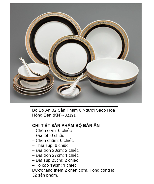 Bộ đồ ăn 32 sản phẩm – Sago – Hoa Hồng Đen khắc nổi Nổi bật với hình ảnh những đóa hồng nhỏ được viền xung quanh mỗi sản phẩm, dòng Sago luôn tôn lên nét sang chảnh và hiện đại theo phong cách Châu Âu. Cộng thêm sự phối kết những gam màu đang được ưa chuộng là xám- vàng trên nền sứ sáng bóng, dù là bộ trà hoặc bộ bàn ăn Hoa hồng hay Hoa hồng đen khắc nổi đều được lòng khách ngay ánh nhìn đầu tiên.