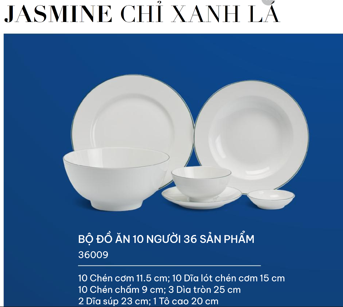 Sự phối kết giữa men sứ trắng và đường chỉ xanh lá chưa bao giờ lỗi mốt và đã tạo cho Jasmine Chỉ xanh lá điểm nhấn đặc biệt bởi nét mềm mại, thanh thoát mà sang trọng, tô điểm không gian ẩm thực thêm phần tươi mát và mới mẻ.