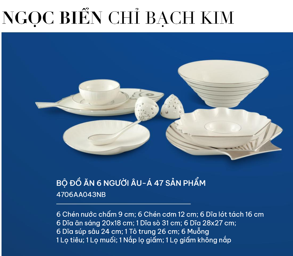 Bộ Ngọc Biển mang hình dáng của những sinh vật biển nhưng lại được tạo hình với kiểu dáng rất sáng tạo và độc đáo tạo cho người sở hữu cảm giác thích được sử dụng và trải nghiệm thức ăn đồ uống với bộ sản phẩm. Đặc biệt, những họa tiết bằng bạc được tô vẽ trên nền kem ngà ấm áp vừa giữ được nét sang trọng, vừa toát lên sự trẻ trung đáp ứng đa dạng sở thích của chủ sở hữu mà vẫn giữ được tinh hoa ẩm thực.