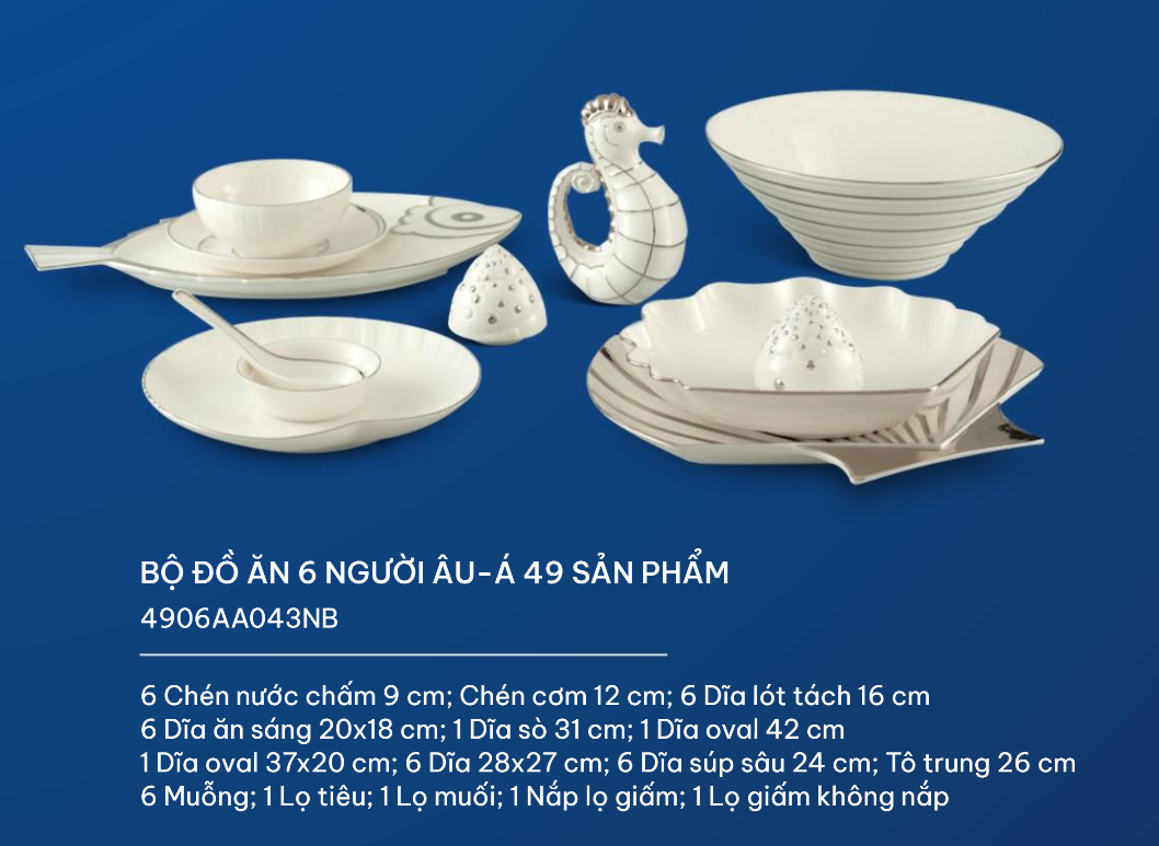 Bộ Ngọc Biển mang hình dáng của những sinh vật biển nhưng lại được tạo hình với kiểu dáng rất sáng tạo và độc đáo tạo cho người sở hữu cảm giác thích được sử dụng và trải nghiệm thức ăn đồ uống với bộ sản phẩm. Đặc biệt, những họa tiết bằng bạc được tô vẽ trên nền kem ngà ấm áp vừa giữ được nét sang trọng, vừa toát lên sự trẻ trung đáp ứng đa dạng sở thích của chủ sở hữu mà vẫn giữ được tinh hoa ẩm thực.