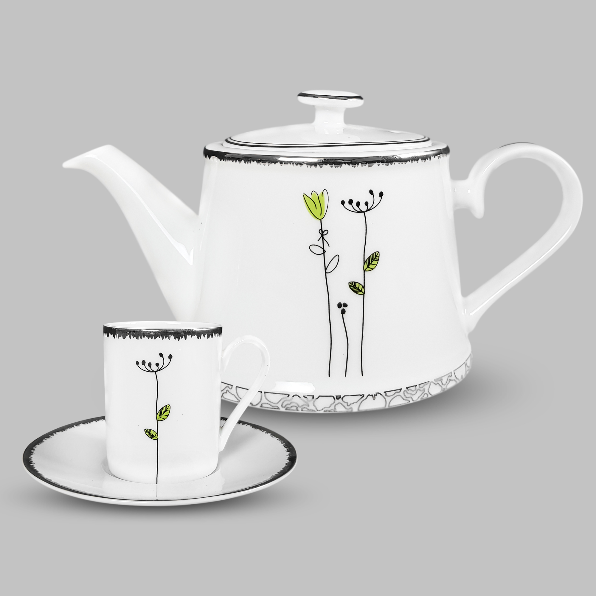 Bộ tách trà gồm: + 1 Bình Trà – 567PL - 540ml + 6 Tách Trà – C027 - 80ml + 6 Dĩa Lót – S027 - 11.5cm |