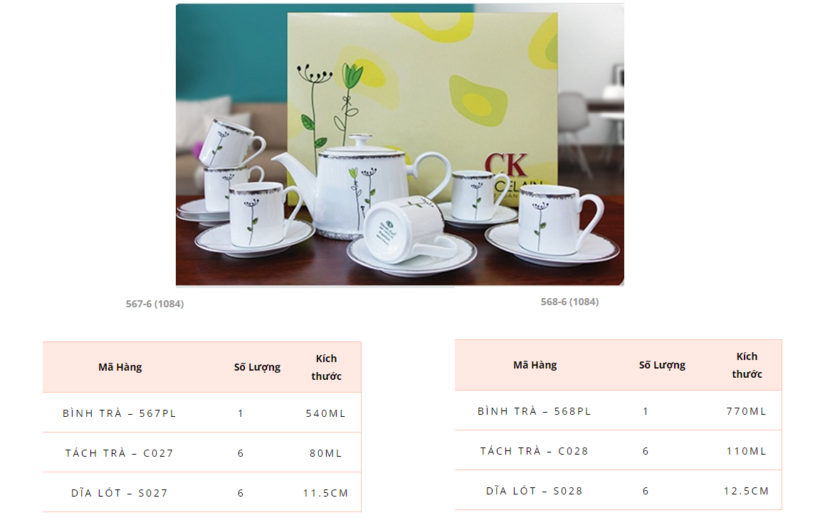 Bộ tách trà gồm: + 1 Bình Trà – 568PL - 770ml + 6 Tách Trà – C028 - 110ml + 6 Dĩa Lót – S028 - 12.5cm |