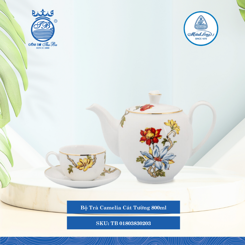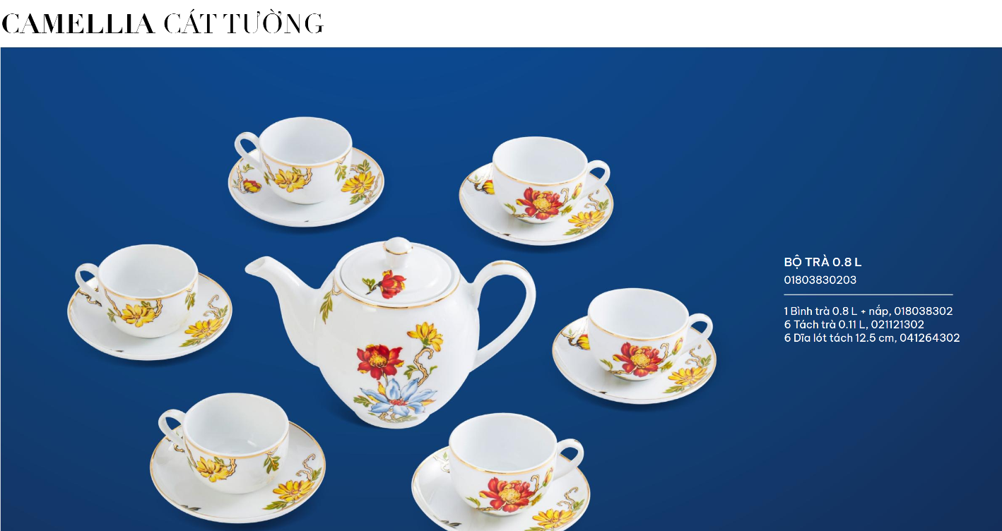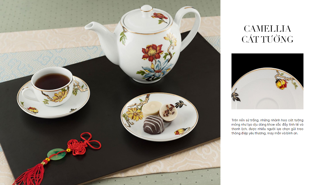 Trên nền sứ trắng ngà, những nhành hoa Cát tường mỏng như lụa dịu dàng khoe sắc như con gái đôi mươi. Cầm trên tay bộ trà hay bộ bàn ăn này, ta đều cảm nhận vẻ đẹp nhẹ nhàng, ngọt ngào và quý phái.