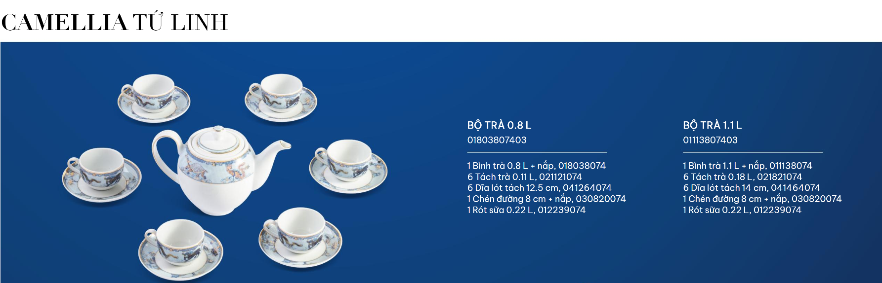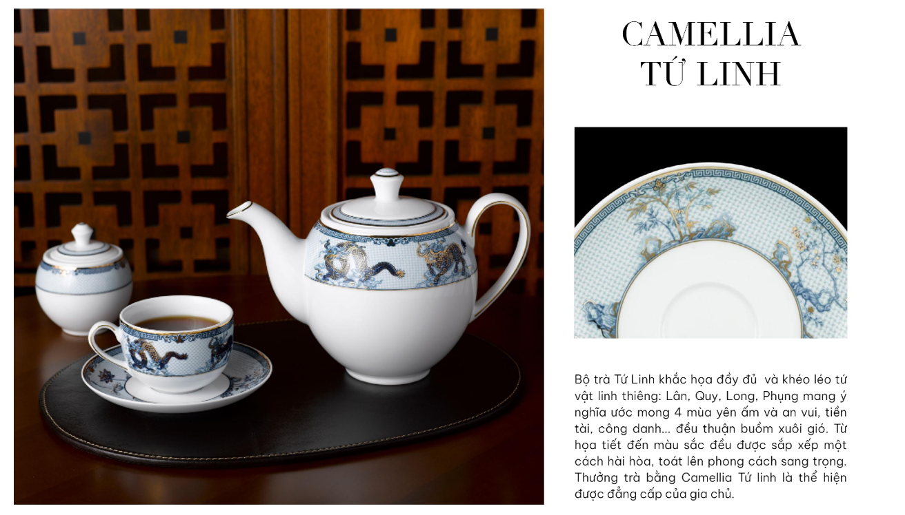 Bộ trà Tứ Linh khắc họa đầy đủ và khéo léo tứ vật linh thiêng: Lân, Quy, Long, Phụng mang ý nghĩa ước mong 4 mùa yên ấm và an vui, tiền tài, công danh... đều thuận buồm xuôi gió. Từ họa tiết đến màu sắc đều được sắp xếp một cách hài hòa, toát lên phong cách sang trọng. Thưởng trà bằng Camellia Tứ linh là thể hiện được đẳng cấp của gia chủ.