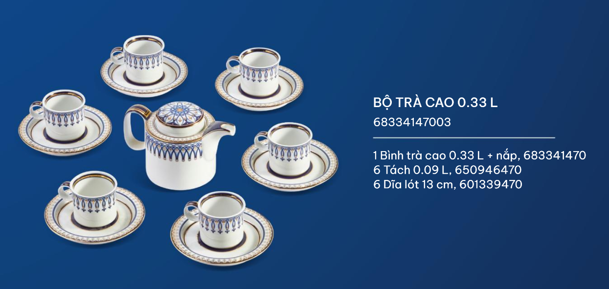 Bộ trà nổi bật với thiết kế độc đáo, mang phong cách hiện đại, tạo ấn tượng với vẻ đẹp sang trọng, kiểu dáng tinh tế và sự tinh xảo trong từng đường nét, chi tiết. Những họa tiết được thiết kế độc đáo, mang tính đối xứng, lặp lại tạo nên sự mới lạ, khác biệt và nét đẹp hiện đại, ấn tượng. Sự phối màu hài hòa giữa sứ trắng cùng những họa tiết màu xanh dương và điểm nhấn viền chỉ vàng tạo nên sự sang trọng, đẳng cấp cho tác phẩm.