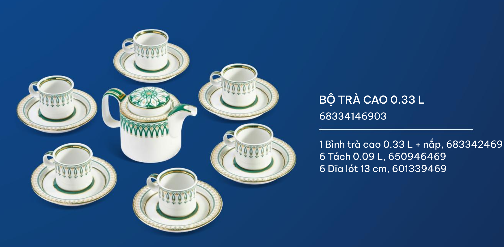 Bộ trà nổi bật với thiết kế độc đáo, mang phong cách hiện đại, tạo ấn tượng với vẻ đẹp sang trọng, kiểu dáng tinh tế và sự tinh xảo trong từng đường nét, chi tiết. Những họa tiết được thiết kế độc đáo, mang tính đối xứng, lặp lại tạo nên sự mới lạ, khác biệt và nét đẹp hiện đại, ấn tượng. Sự phối màu hài hòa giữa sứ trắng cùng những họa tiết màu xanh lá và điểm nhấn viền chỉ vàng tạo nên sự sang trọng, đẳng cấp cho tác phẩm.