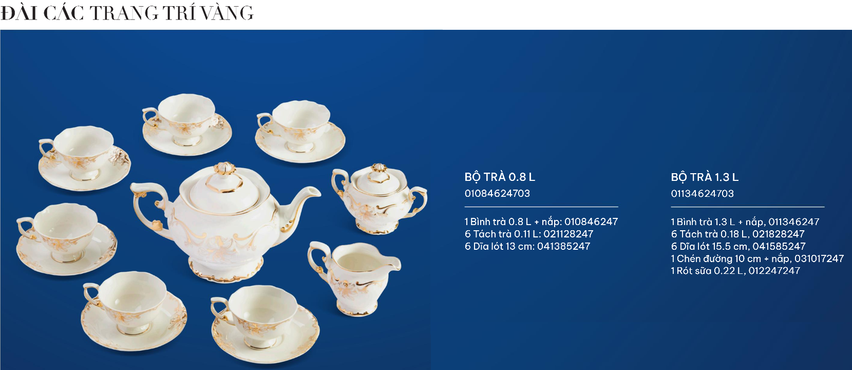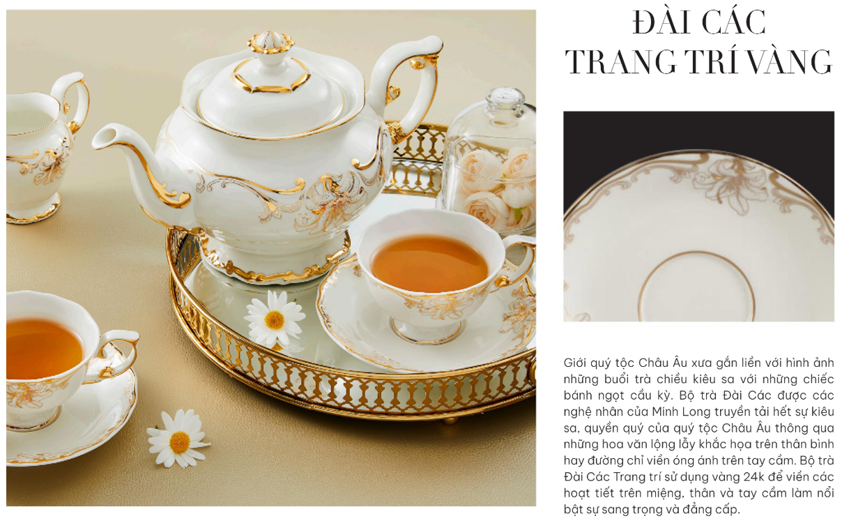 Cái tài của các nghệ nhân là đã khéo léo viền chỉ vàng ở những điểm nổi bật như vành chén, vành đĩa, tay cầm và nắp bình trà, trong đó nổi bật là núm sen vàng sang trọng. Hoa văn được nhấn nhá bằng những đường viền óng ánh vô cùng đẹp mắt, , càng tôn lên vẻ đẹp đẳng cấp của không gian ẩm thực cũng như phong cách thẩm mỹ của chủ sở hữu.