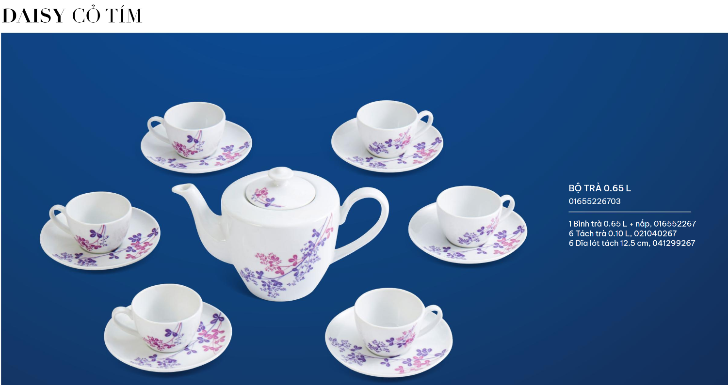 Daisy cỏ tím là bộ sản phẩm kết hợp giữa phong cách cổ điển và hiện đại. Những nhành cỏ tím uốn lượn mềm mại trên nền men sứ sáng bóng tạo nên sự thanh thoát nhưng không kém phần sang trong trong từng bình trà, tách, tô, chén chấm…