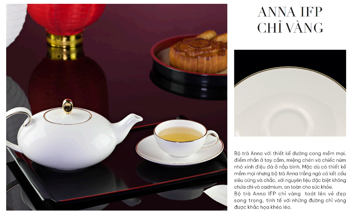 Không họa tiết rườm rà hay kiểu cách cầu kỳ nhưng Anna vẫn toát lên sự sang trọng, tinh tế cần có của một bộ trà. Anna đa dạng dòng sản phẩm, từ trắng ngà và chỉ vàng đến họa tiết sen quen thuộc nhằm đáp ứng đa dạng sở thích của khách hàng mà vẫn đảm bảo hoàn hảo về kỹ thuật và mỹ thuật, lưu giữ trọn vẹn hương-vị-sắc của trà và là cầu nối gắn kết những mối tình thâm…