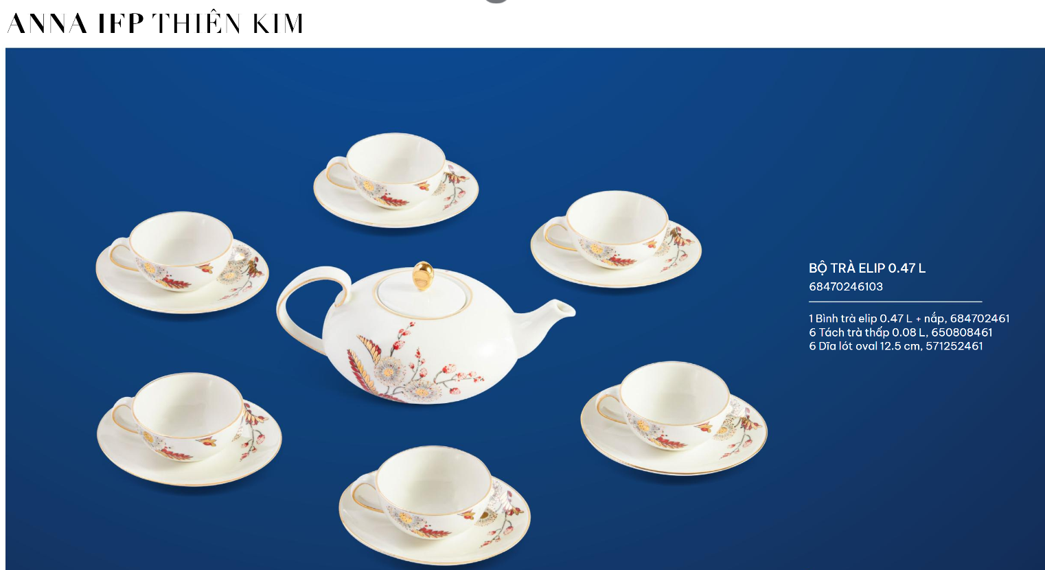 Không họa tiết rườm rà hay kiểu cách cầu kỳ nhưng Anna vẫn toát lên sự sang trọng, tinh tế cần có của một bộ trà. Anna đa dạng dòng sản phẩm, từ trắng ngà và chỉ vàng đến họa tiết sen quen thuộc nhằm đáp ứng đa dạng sở thích của khách hàng mà vẫn đảm bảo hoàn hảo về kỹ thuật và mỹ thuật, lưu giữ trọn vẹn hương-vị-sắc của trà và là cầu nối gắn kết những mối tình thâm...