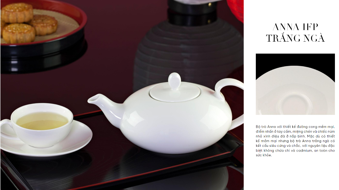 Không họa tiết rườm rà hay kiểu cách cầu kỳ nhưng Anna vẫn toát lên sự sang trọng, tinh tế cần có của một bộ trà. Anna đa dạng dòng sản phẩm, từ trắng ngà và chỉ vàng đến họa tiết sen quen thuộc nhằm đáp ứng đa dạng sở thích của khách hàng mà vẫn đảm bảo hoàn hảo về kỹ thuật và mỹ thuật, lưu giữ trọn vẹn hương-vị-sắc của trà và là cầu nối gắn kết những mối tình thâm...