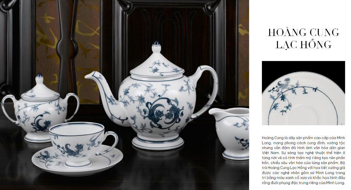 Bộ trà Hoàng Cung Lạc Hồng với họa tiết vương giả được các nghệ nhân gốm sứ Minh Long trang trí bằng màu xanh cổ xưa và khắc họa hình đầu rồng đuôi phụng đặc trưng riêng của Minh Long.