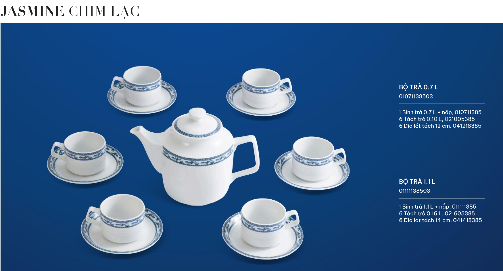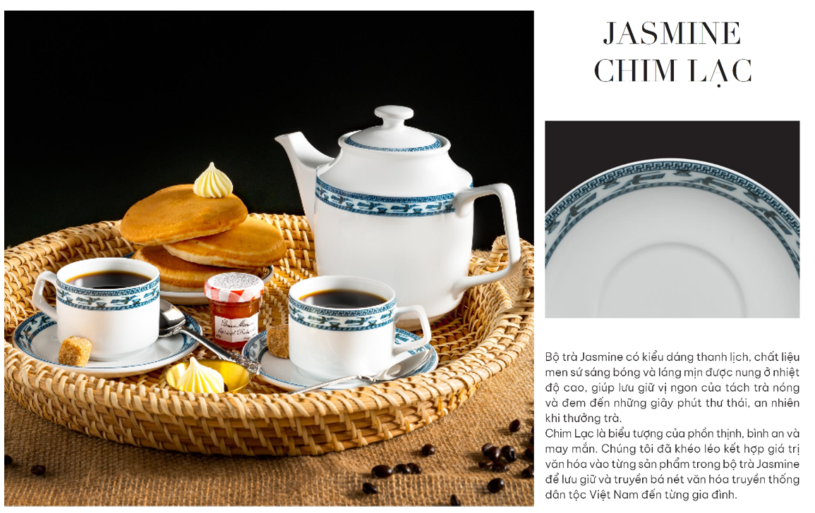 Chim Lạc là một trong những linh vật truyền thống từ thời dựng nước, một thời là biểu tượng của đất nước Âu Lạc. Chim Lạc cũng là biểu tượng của phồn thịnh, bình an và may mắn. Khéo léo kết hợp giá trị văn hoá vào sản phẩm sứ gia dụng, Minh Long I đã cho ra đời bộ hoa văn Jasmine Chim Lạc với từng đường nét hoa văn mang đậm nét truyền thống, cổ điển, nhưng vừa sang trọng vừa nhã nhặn, tinh tế và hiện đại.