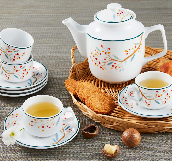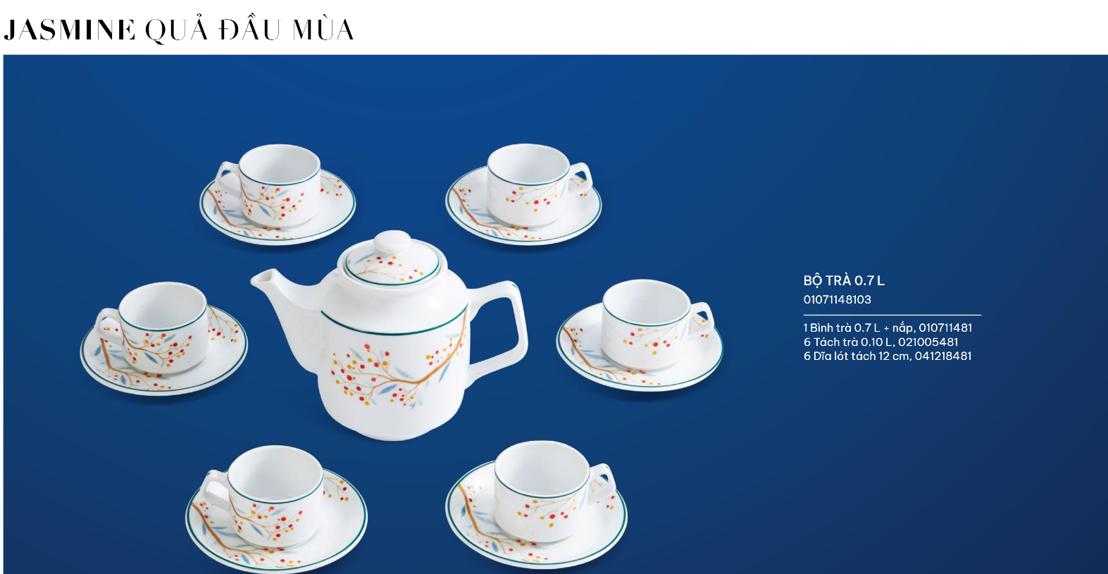 Bộ trà Jasmine Quả Đầu Mùa có kiểu dáng thanh lịch, chất liệu men sứ sáng bóng và láng mịn được nung ở nhiệt độ cao, giúp lưu giữ vị ngon của tách trà nóng và đem đến những giây phút thư thái, an nhiên khi thưởng trà.