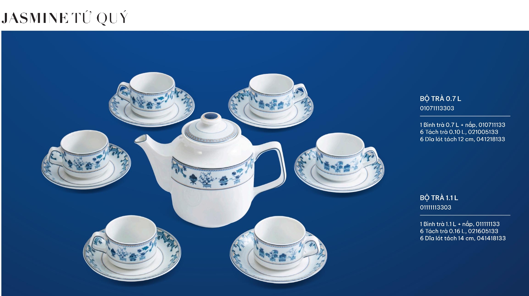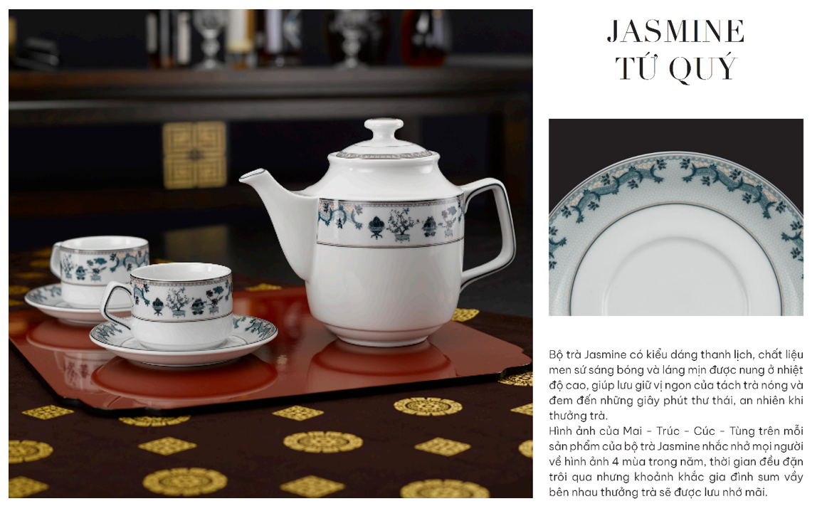 Bộ sản phẩm Tứ quý quy tụ 4 loài cây đại diện cho 4 mùa: Mai (mùa xuân), Trúc (mùa hạ), Cúc (mùa Thu), Tùng (mùa Đông), mang đến cho chủ sở hữu sự phú quý, sung túc và may mắn. Trên mỗi sản phẩm, 4 loài cây được khắc họa xen kẽ một cách khéo léo tạo nên một bộ tứ vừa vững chãi vừa mảnh mai. Đồng thời, sắc xanh hòa cùng men sứ trắng ngà tạo nên bức tranh thiên nhiên nhiều sắc màu với bao lời chúc tốt lành.