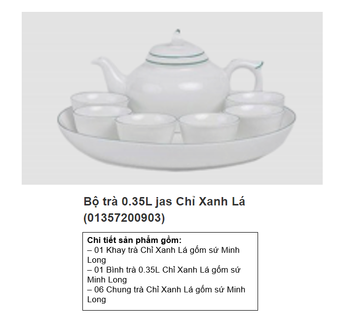 Bộ trà 0.35L Chỉ Xanh Lá 01357200903 gốm sứ Minh Long 1 gồm: