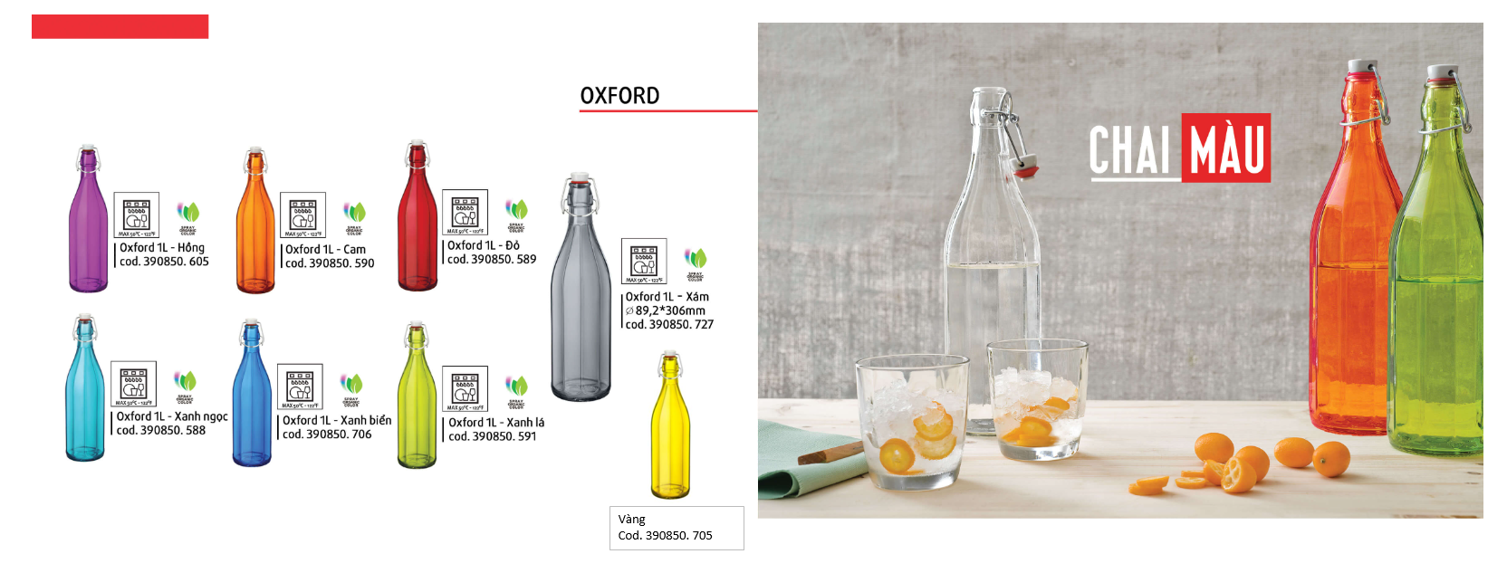 Phạm vi sản phẩm rất rộng: ly, ly uống rượu, bình gạn, bình, cốc, đĩa, bát, bát salad, lọ cho các sản phẩm số lượng lớn, dao kéo, phụ kiện sắp xếp bàn ăn, hộp đựng thực phẩm, bình hoa, v.v.