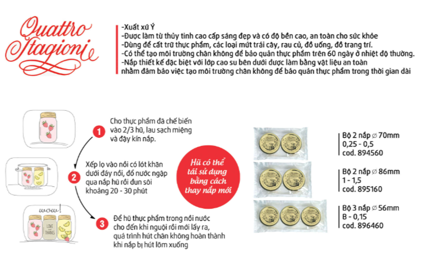 Bảo quản thực phẩm đã chế biến trên 60 ngày ở nhiệt độ thường. Ưu điểm của hũ thủy tinh Quattro Stagion Chất liệu thủy tinh cao cấp Hũ được làm từ thủy tinh cao cấp sáng đẹp và có độ trong tinh khiết, an toàn cho sức khỏe người dùng.