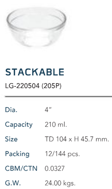 Chén Vang STACKABLE Ø: 10.4cm 210ml Cao: 4.6cm 144 Cái/Thùng 12 Cái/Hộp 24Gr. Lucky Glass Thủy Tinh TL Bowl LG 220504 205P
