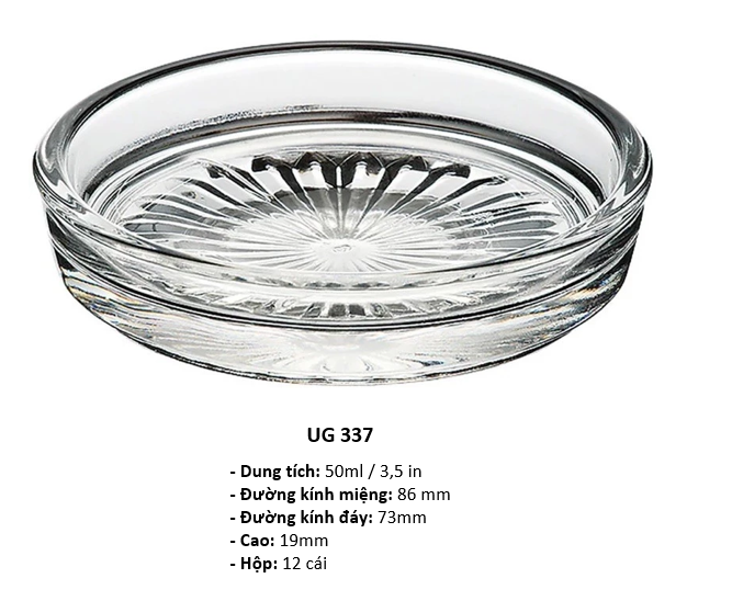 | UG 337 | Ø: 8.6cm - ØĐáy: 7.3cm - 50ml - Cao: 1.9cm - 12 lố/Thùng - 12 c/Hộp - 19Gr. |