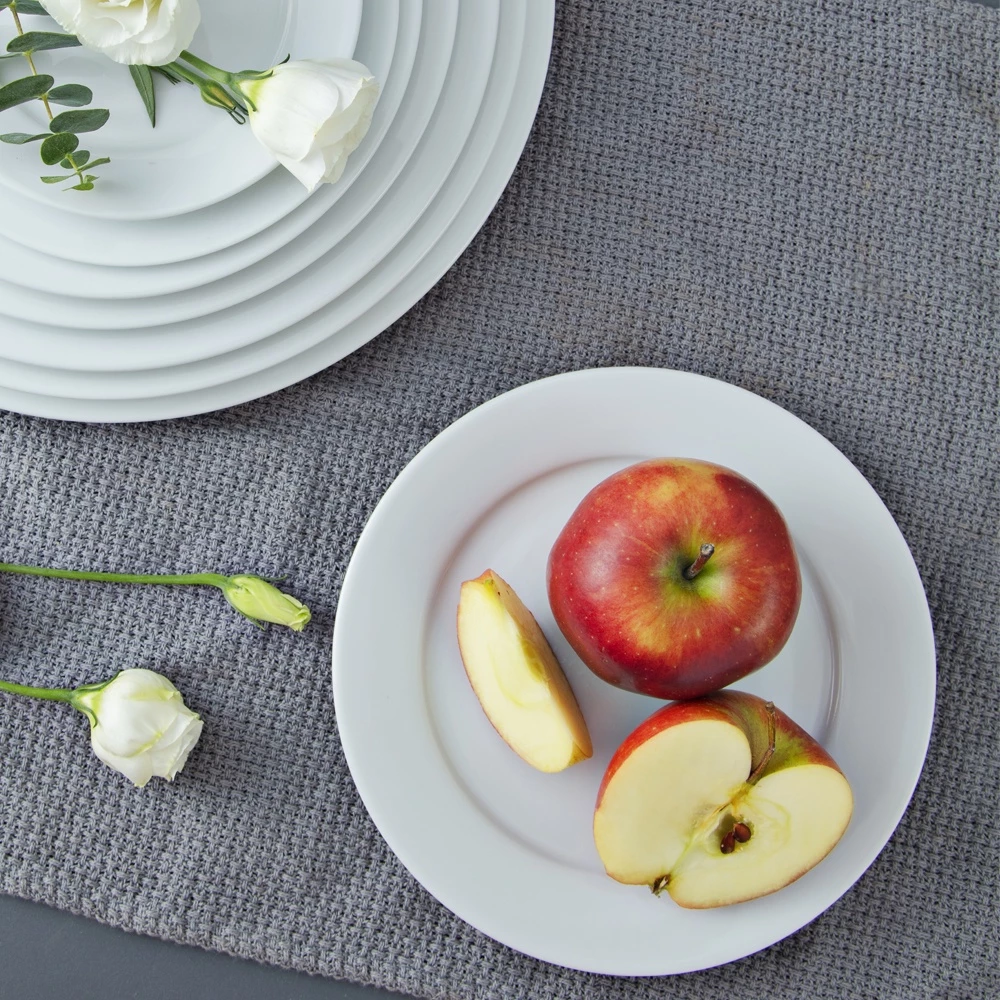 Đĩa bằng sứ trắng cao cấp với nước men trắng sáng bóng hướng tới sự tao nhã, tinh tế, nhờ đó mà khách hàng có thể sử dụng để bày biện, trang trí, đặt đồ ăn lên trên và biến tấu theo gu thẩm mỹ của mình.
