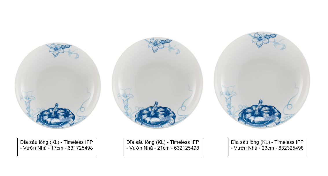 Trên nền sứ trắng thanh khiết, hình ảnh những quả bí ngô to tròn, những bông hoa đang bung nở được phác họa một cách chân thực, tinh tế. Khéo léo chọn màu xanh cobalt để tô vẽ lên sứ trắng là cách những nghệ nhân Minh Long tạo điểm nhấn khác biệt và mang đến sự đột phá mới lạ, độc đáo cho bộ sản phẩm.
