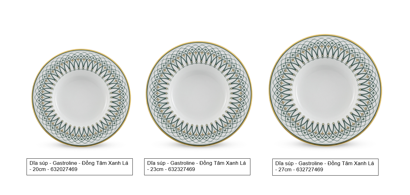 Sự phối màu hài hòa giữa những họa tiết màu xanh dương trên nền sứ trắng và điểm nhấn viền chỉ vàng góp phần tăng thêm sự sang trọng, đẳng cấp. Hoa văn Đồng Tâm Xanh Lá với những họa tiết được thiết kế tinh xảo mang tính đối xứng và đồng tâm tạo nên sự mới lạ, khác biệt và ấn tượng.