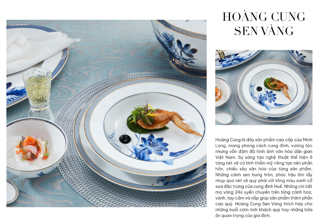 Sen Vàng khắc họa những cánh sen bung tròn, phúc hậu ôm lấy nhụy qua nét vẽ quý phái với tông màu xanh cổ xưa đặc trưng của cung đình Huế. Những chi tiết mạ vàng 24k uyển chuyển trên từng cánh hoa, vành, tay cầm và nắp giúp sản phẩm thêm phần cao quý. Hoàng Cung Sen Vàng thích hợp cho những buổi đón tiếp khách mời quan trọng của gia đình.