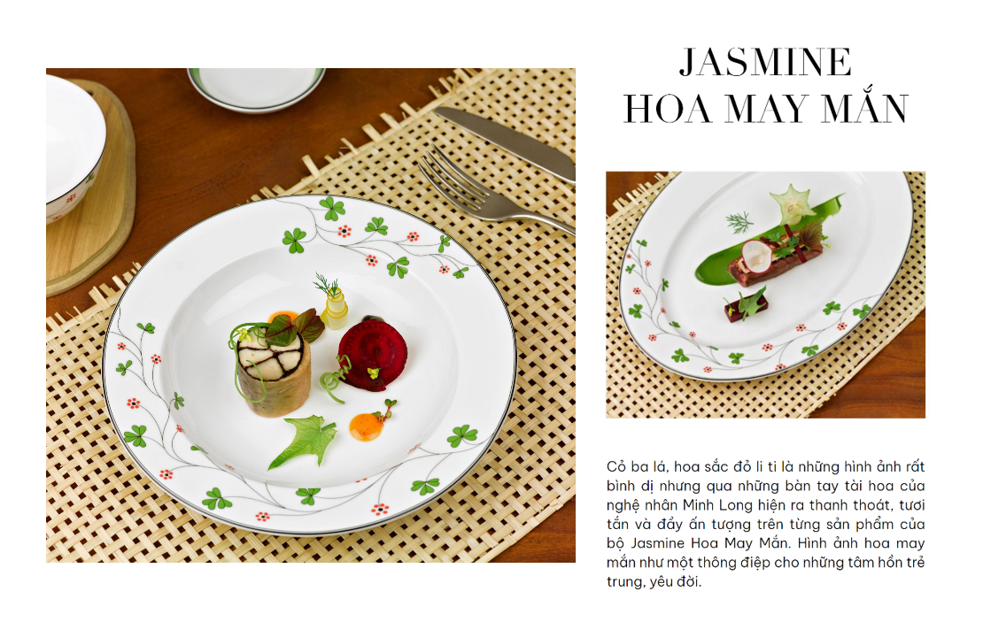 Những lá cỏ ba lá, hoa đỏ li ti rất bình dị nhưng qua những bàn tay tài hoa của nghệ nhân Minh Long hiện ra thanh thoát, tươi tắn và đầy ấn tượng. Màu sắc hài hoà với từng nét vẽ nhỏ xinh trên nền sứ trắng, thể hiện độ tinh xảo của sản phẩm cũng như sự chăm chút tỉ mỉ của nhà sản xuất. Bộ hoa văn Hoa may mắn như một sản phẩm đặc biệt dành cho những tâm hồn trẻ trung, yêu đời. Bộ bàn ăn với các sản phẩm đa dạng phù hợp với nhiều gia đình, thêm nhiều lựa chọn cho khách hàng, như: bộ bàn ăn, bộ trà... Bộ sản phẩm cũng là quà tặng thiết thực và ý nghĩa dành cho những người thân yêu.