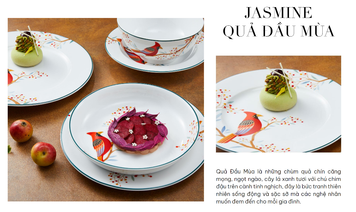 Lấy cảm hứng từ hoa nhài thuần khiết với hương thơm ngào ngạt, vẻ đẹp thanh tao được nhiều người yêu thích, chúng tôi đã chế tác nên bộ bàn ăn Jasmine với những đường nét uốn lượn mềm mại. Quả đầu mùa là những chùm quả chín căng mọng, ngọt ngào, cây lá xanh tươi với chú chim đậu trên cành tinh nghịch, đây là bức tranh thiên nhiên sống động và rực rỡ mà các nghệ nhân muốn đem đến cho mỗi gia đình.