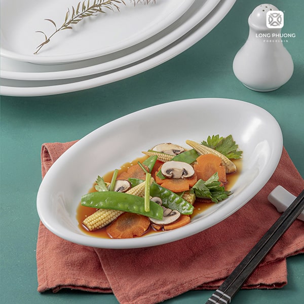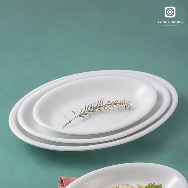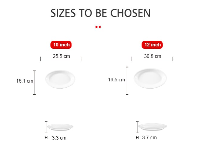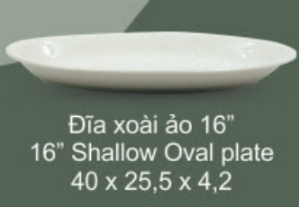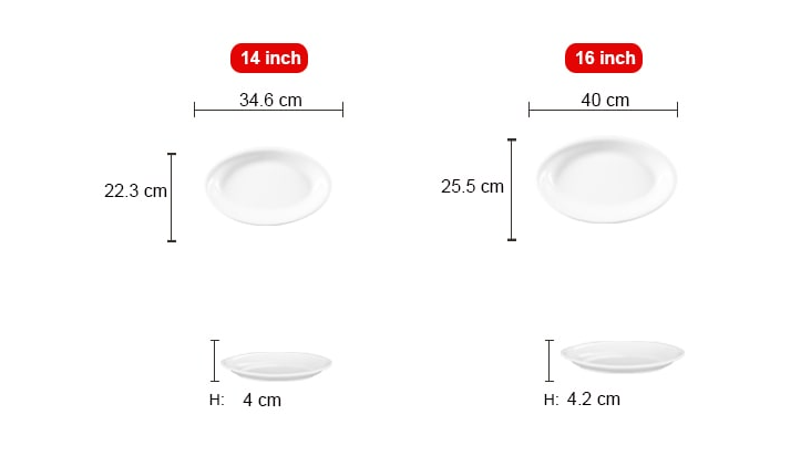 Đĩa xoài ảo 10-12-14-16 Inch hay còn gọi là đĩa Oval, có chiều dài đa dạng, lòng đĩa sâu hơn so với các loại đĩa bằng một chút, phù hợp bày biện các món ăn như xào, luộc, chiên…