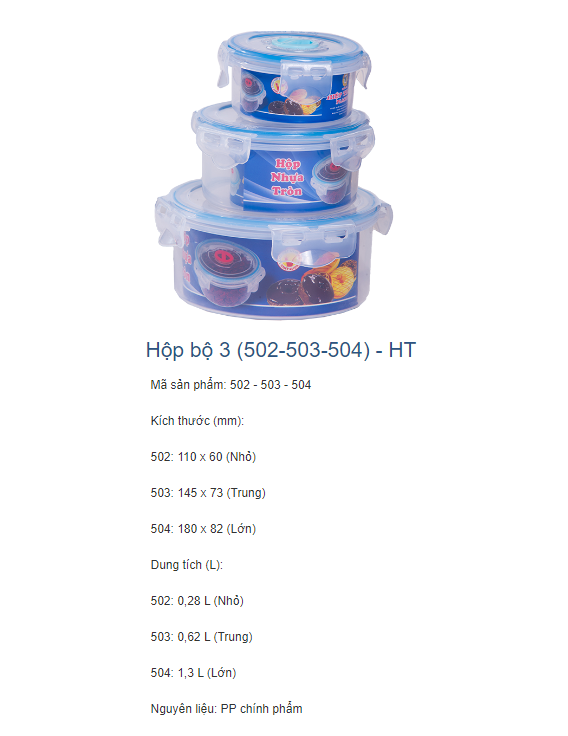 Hộp (502-503-504) - Hiệp Thành HI là sản phẩm hộp giúp việc lưu trữ thực phẩm được lâu hơn mà thực phẩm vẫn tươi ngon.