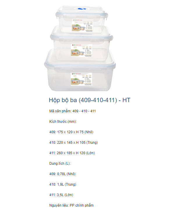 Hộp bộ 3 (409-410-411) - Hiệp Thành HB3-3 được làm bằng chất liệu nhựa PP dày dặn, bền đẹp, đồng thời không chứa các chất BPA gây hại, đảm bảo an toàn cho sức khỏe người dùng.
