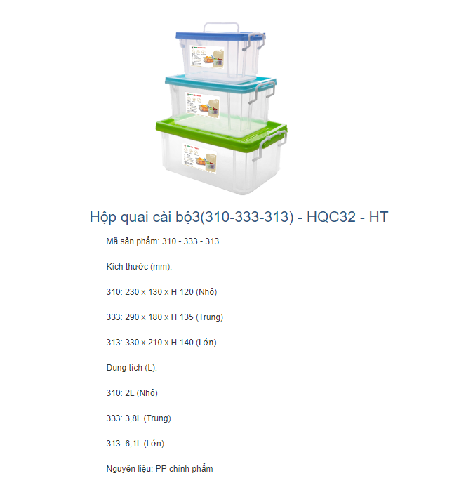 Hộp quai cài bộ3 (313-333-313) - Hiệp Thành HQC32 HI được làm bằng chất liệu nhựa PP dày dặn, bền đẹp, đồng thời không chứa các chất BPA gây hại, đảm bảo an toàn cho sức khỏe người dùng.