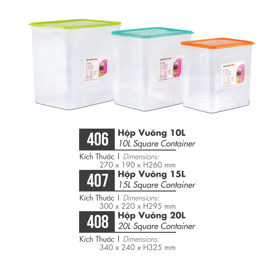 • Hộp nhựa được thiết kế tiện lợi và thông minh với nhiều kích thước lớn nhỏ khác nhau: hình trụ, hình chữ nhật, hình vuông,…