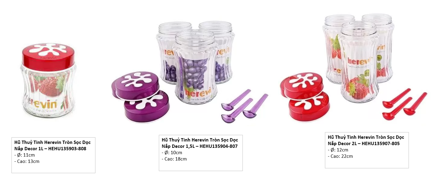 Hũ thủy tinh Herevin Decor, giúp chứa đựng được gia vị. Sản phẩm còn có nhiều màu sắc khác nhau để người dùng có thể lựa chọn mua về sử dụng.