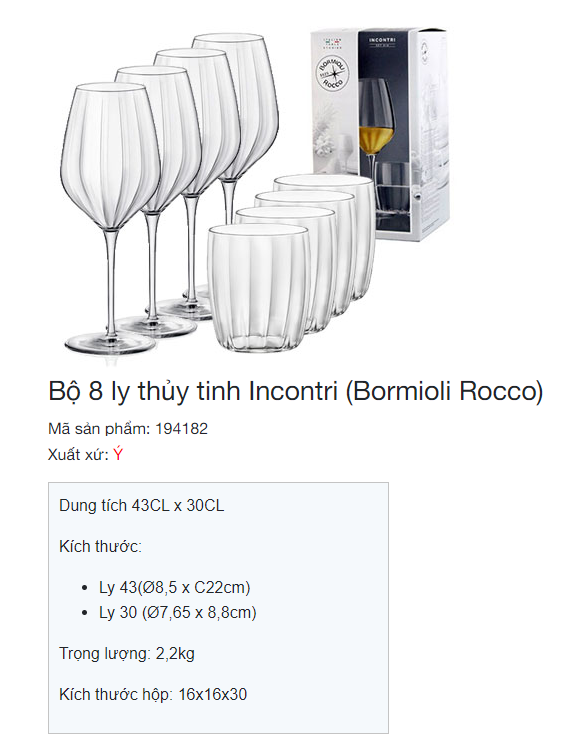 Thương hiệu Bormioli của Ý, không chỉ đáp ứng hầu hết các nhu cầu về chai lọ, ly cốc, chén, đĩa... của ngành dược phẩm, mỹ phẩm, thực phẩm và ăn uống mà còn đã trở thành tập đoàn hàng đầu Châu Âu chuyên cung cấp đầy đủ và đa dạng các sản phẩm bằng thủy tinh phục vụ trên bàn ăn. Sang trọng, phong cách và tinh tế tạo nên bộ ba giá trị mà dòng sản phẩm Bormioli mang đến cho mọi bữa tiệc của bạn.